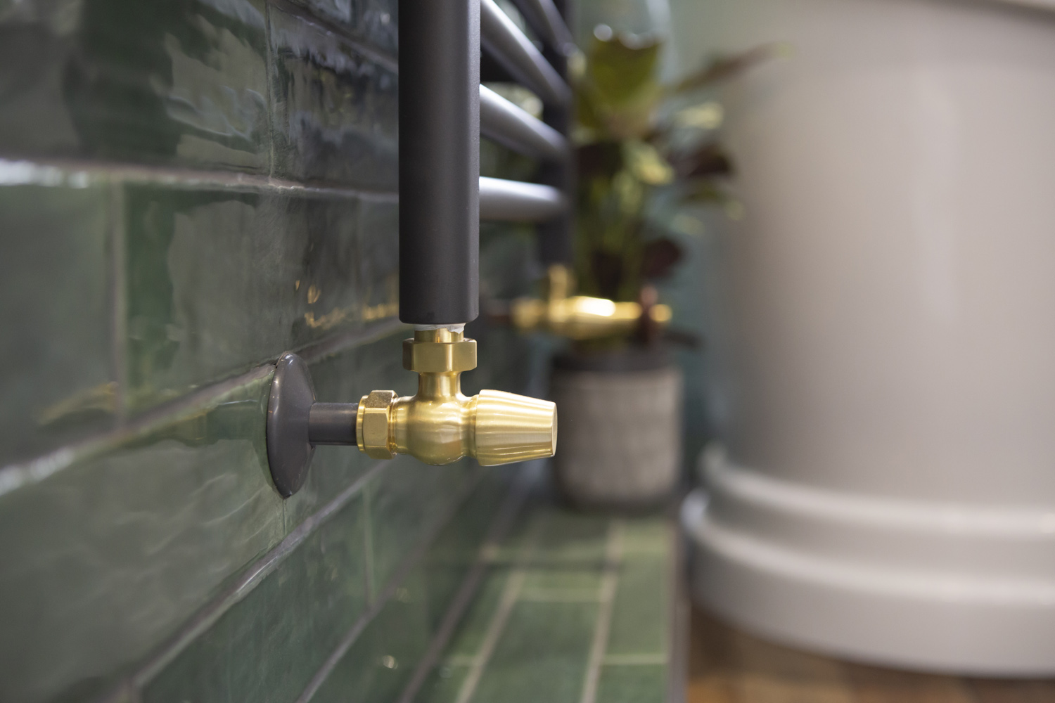 Lee likes to work on a principle of three or four colours - two or three backdrop colours, and one highlight colour. In this case, the green and anthracite made a great background for the brass to pop against, whilst the brighter chestnut brown tone of the flooring added a little warmth against the cooler/bluer tones. An anthracite powder coated steel towel rail compliments the bluey – grey tinge in the tiles and the grey-grout used to lay them. These little details combine to create a beautiful bathroom.