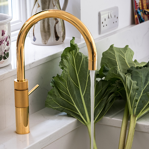 The new kitchen is now where Rachel and Keith spend much of their time. Each has their favourite elements. Keith is impressed with the overall flow of the design, and the smart, practical larder cupboard, with its warm, oak-veneer interior. Rachel loves the larder, and her view of the garden, but top of her list are the speed and convenience of the Quooker boiling water tap, and the glamour of its gleaming gold finish. Both are delighted that entertaining has become so much easier and more enjoyable,
