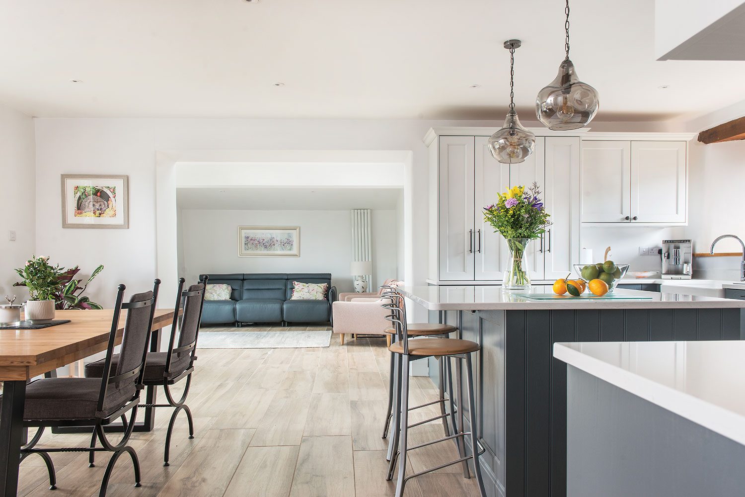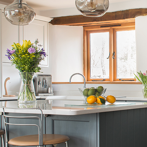 Mark and Val have lived in their beautiful, converted eighteenth-century barn for over twenty-five years. When their oak kitchen finally came to the end of its life, they decided to knock through and remodel the adjoining space at the same time as replacing it. This would create seating with a garden view, and a separate utility room.