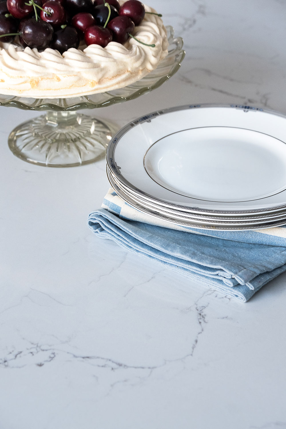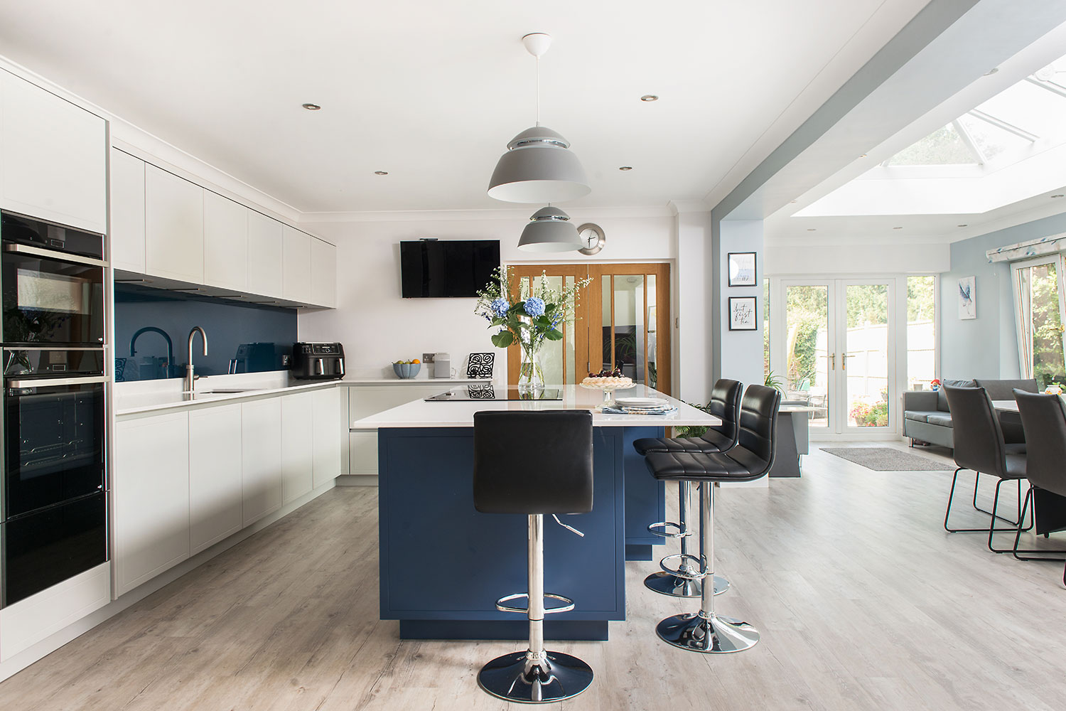 Roz was looking for flat, wipeable doors, with no dust-traps, and browsing the displays, she picked out Stoneham’s Latitude furniture, which ticked the boxes for smart looks, flexibility and fuss-free maintenance. The tall larder unit, with its easy-to-use, glass-sided drawer storage particularly caught her eye. A bold blue island and seamless glass splashback were brought together with subtle pale grey wall-units, and white-and-grey, marble-look quartz work surfaces, all of which struck the right note too.
