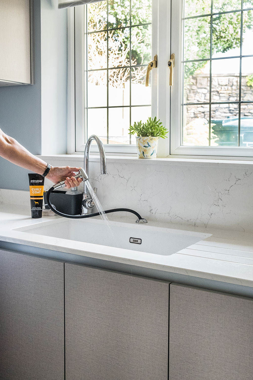 After their initial conversation, Alec visited the couple’s home to measure up and understand the space in detail. Discussing the utility room and boiler room, Roz requested a place to wash their dog Lola after muddy walks. Alec came up with the idea of a large, low-level sink and flexible hand spray in the boiler room, a practical solution that works perfectly. He proposed refitting both rooms with more affordable cabinetry but the same high-spec work tops as in the kitchen,