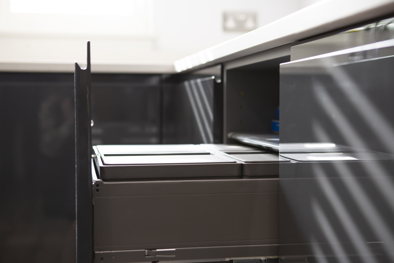 Built-in recycling units hide waste bins neatly inside a cupboard, keeping the kitchen looking tidy while still making them easy to access. Many designs include separate compartments for recycling and general waste, helping households manage waste more efficiently.