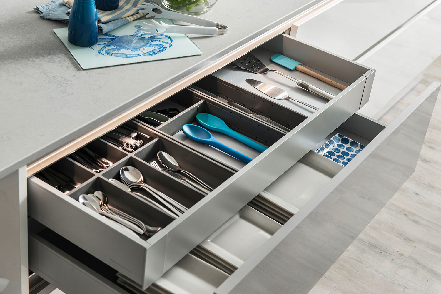 A shallow internal drawer is hidden inside a deeper one, allowing you to store smaller items such as cutlery, utensils or gadgets above larger items like pans or mixing bowls.
