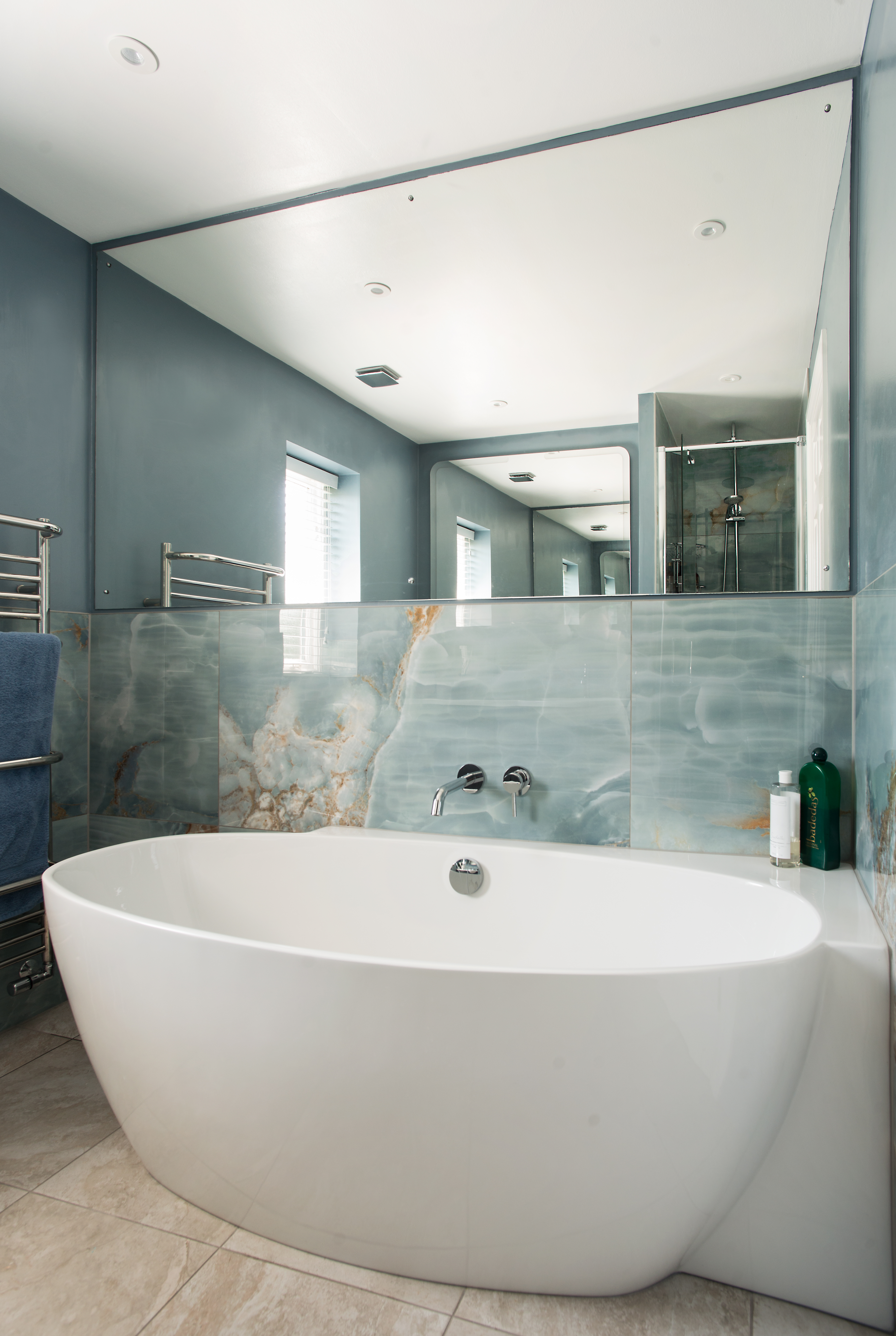 Olga’s designs were focussed on addressing all the issues Natalie and Andrew raised. The bathrooms have been updated with stylish, large-format wall tiles, minimising grout-lines and maximising colour and impact. For each room, she sourced a low-level shower-tray, creating a near-seamless feel. She suggested large, drencher shower heads, and neat, smooth action sliding shower doors that do not jut into the rooms. The noisy, electric shower pumps were replaced by a new pressurised hot water system, boosting water-pressure throughout the house and delivering a powerful shower. Around the hand-basins space-enhancing, built-in storage conceals charging points for toothbrushes and shavers, and keeps surfaces clutter-free.