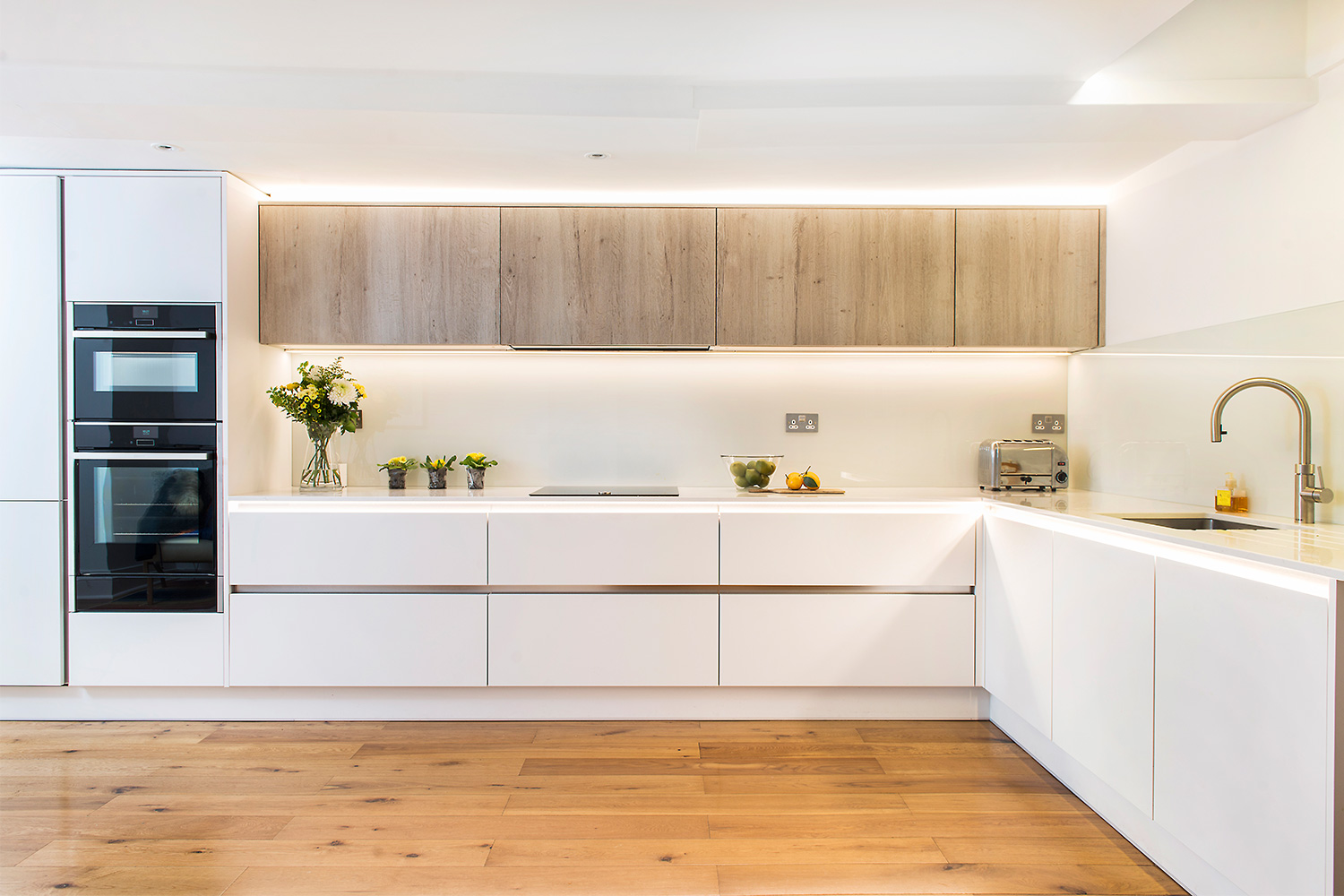 A small light-well above the sink draws some daylight from the upper floor, but extra ceiling spots have been added, as well as remote-controlled lighting above and below the wall units, and beneath the work surfaces. The stylish glow can be adjusted for a warmer or cooler effect, giving practical task lighting, or a softer mood for evening entertaining. Seamless, easy-clean white glass splashbacks bounce the light around too.