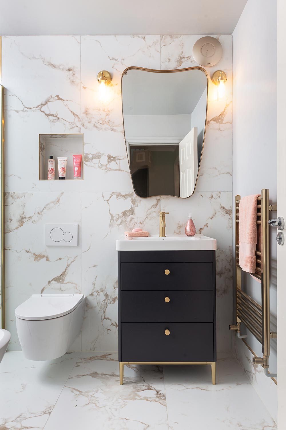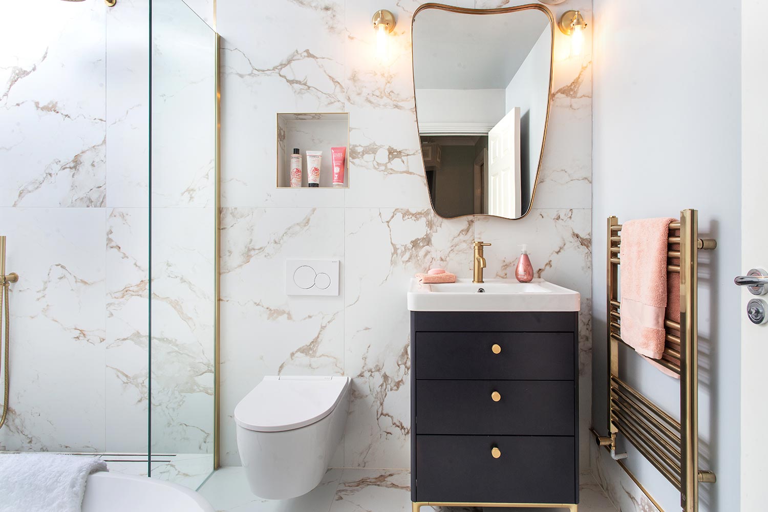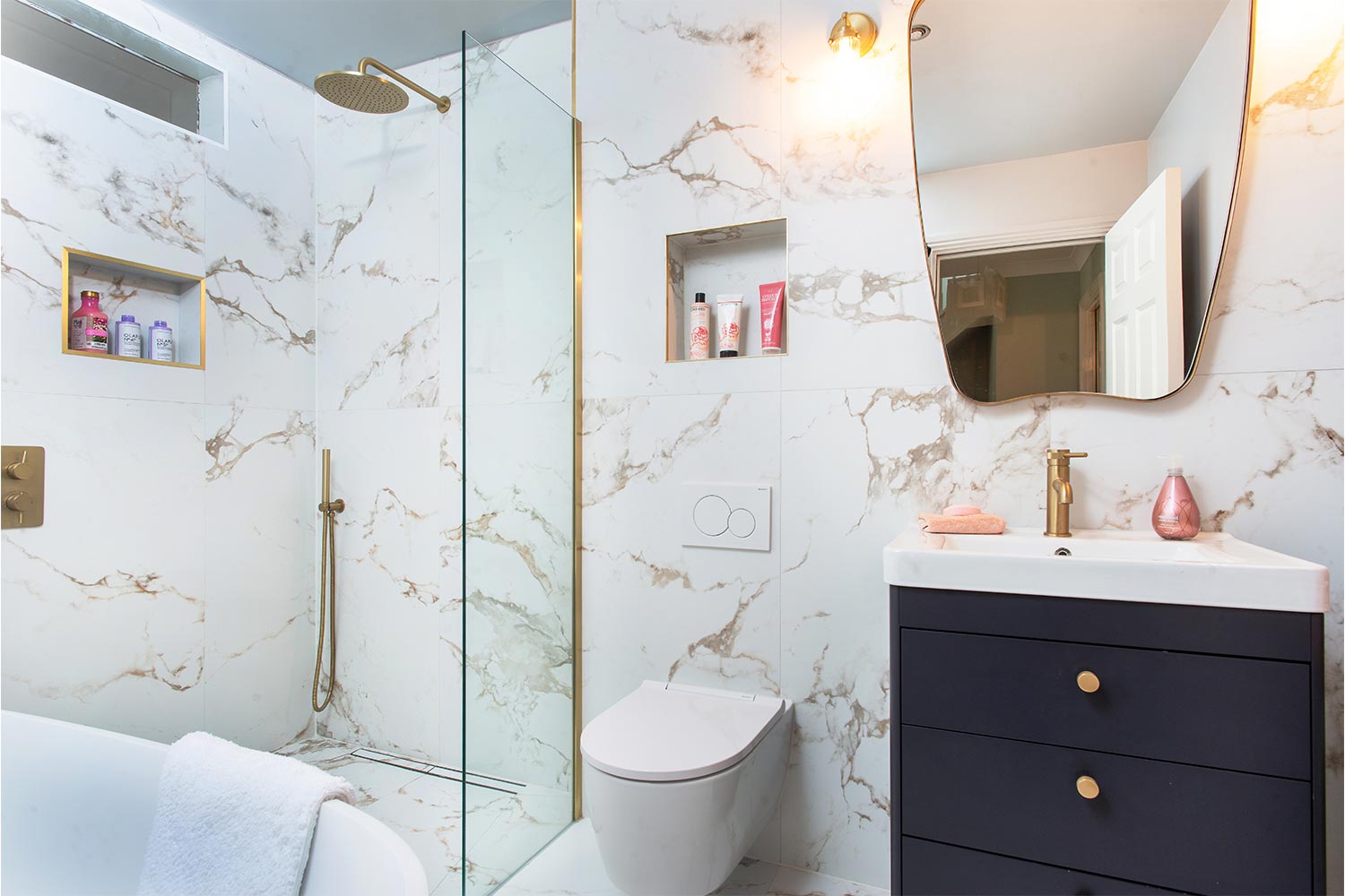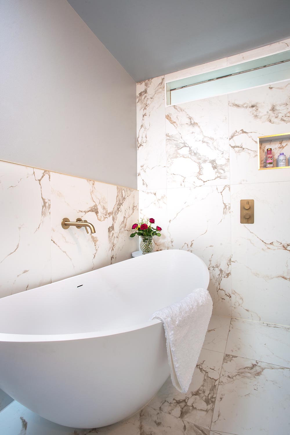 “The bathroom had two entrances, one from the landing and a second, which we didn’t need, from our bedroom,” says Geraldine, “We wanted to block that up, and have a complete re-think, as the bathroom itself felt quite basic, and there was just a handheld shower over the bath. I wanted a fabulous, standalone, wet-room style shower, and Michael liked the idea of a big, beautiful, feature bath.”
