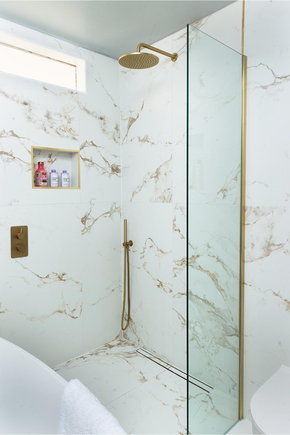 Looking around the showroom, the couple also picked out simple, understated taps and shower fittings in a stylish, brushed brass finish. The shower is a favourite feature for both Michael and Geraldine. Even with the bedroom door blocked up, Geraldine was unsure that there would be room for both the bath and the spacious shower enclosure they had in mind. She need not have worried, as David’s design makes excellent use of the space and more than meets expectations. They were keen to achieve a seamless, wet-room effect, so they were delighted when, rather than a conventional central shower drain, David showed them a neat, linear ‘infinity’ drain that sits close to the wall and blends discreetly into the tiled floor. There is a minimal glass screen, generous overhead drencher, and as an added bonus, the wall-mounted hand-spray can be used both under the shower, and for rinsing the bath,