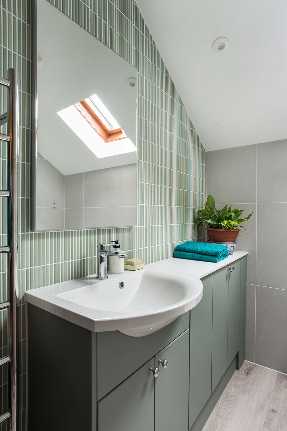 As both bathrooms are quite compact and have slanting ceilings, there was little scope for changing the layouts. After listening to Iain and Billie’s requirements, Daisy focussed on making them more comfortable and enjoyable to use, giving each room a fresh, modern feel and improving showering and storage options. For continuity and simplicity, she proposed similar or matching products in both rooms, but with an injection of blue tones in the ensuite, and greens in the family bathroom to give each a distinct personality.