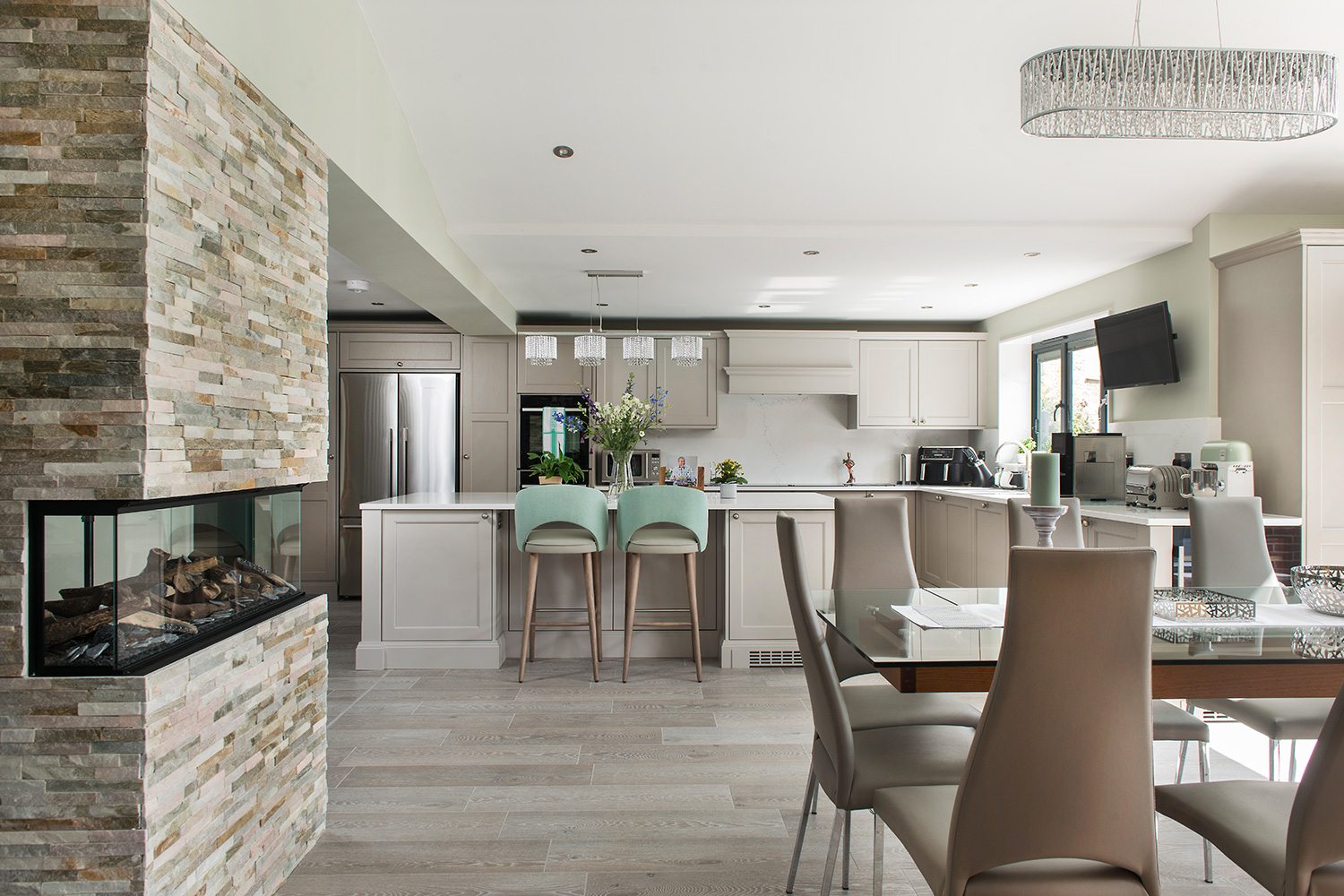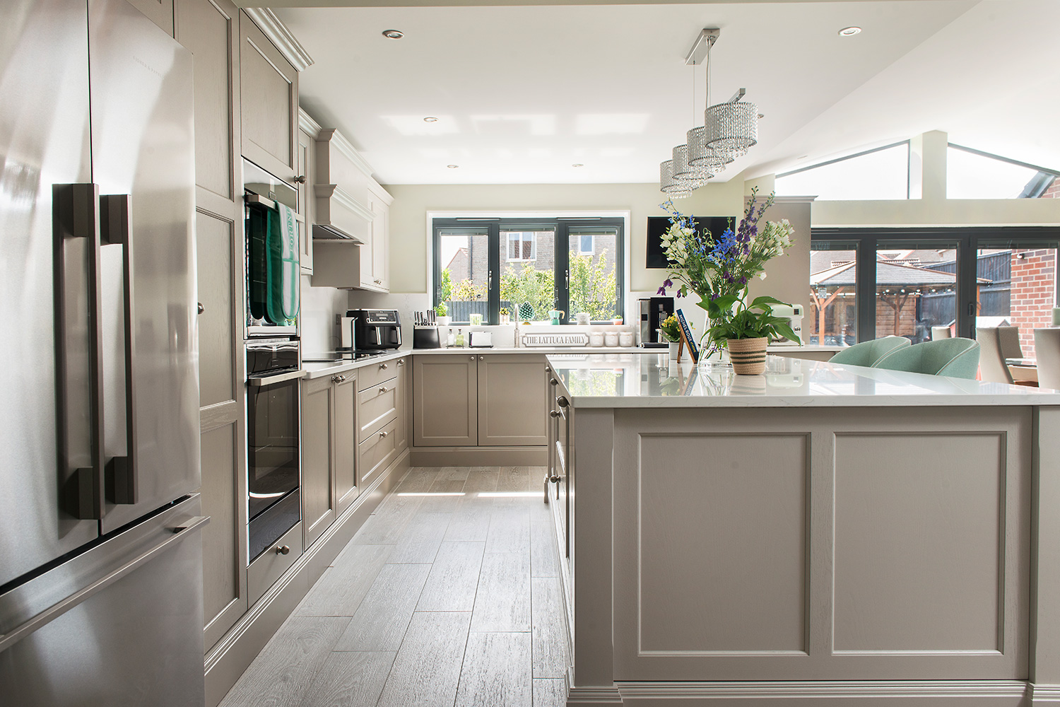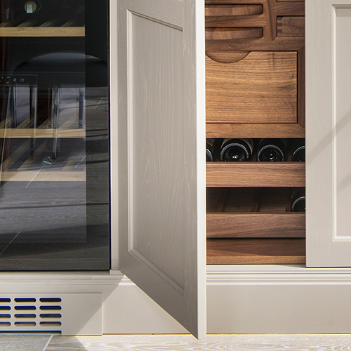 Selina and Carmelo chose smart, modern appliances and Stoneham’s classic Cudham cabinetry, in two subtle neutral colours. In the centre is a large freestanding island. The pantry, complete with walnut drawers personalised with the family name, anchors one end of an L-shaped run of wall-units. At the other end, the bar and wine-cooler face towards the dining table. There is also a dedicated drinks fridge on the outer side of the island, and the three together create a stylish dining and entertaining zone, distinct from the cooking area,