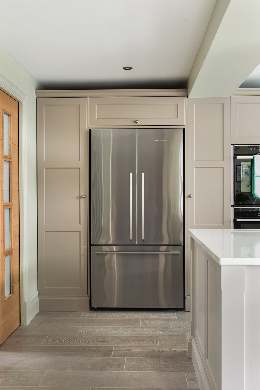 Selina and Carmelo talked over their ideas and kitchen ‘must-haves’ with Alec. Their list included a French-style, double-door fridge-freezer, two ovens, an induction hob and a warming drawer, as well as plenty of workspace and deep storage drawers. When they examined Stoneham’s beautifully finished and thoughtfully designed pantry and bar units, they knew they wanted to include those too.