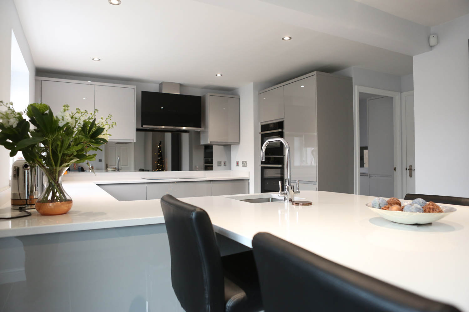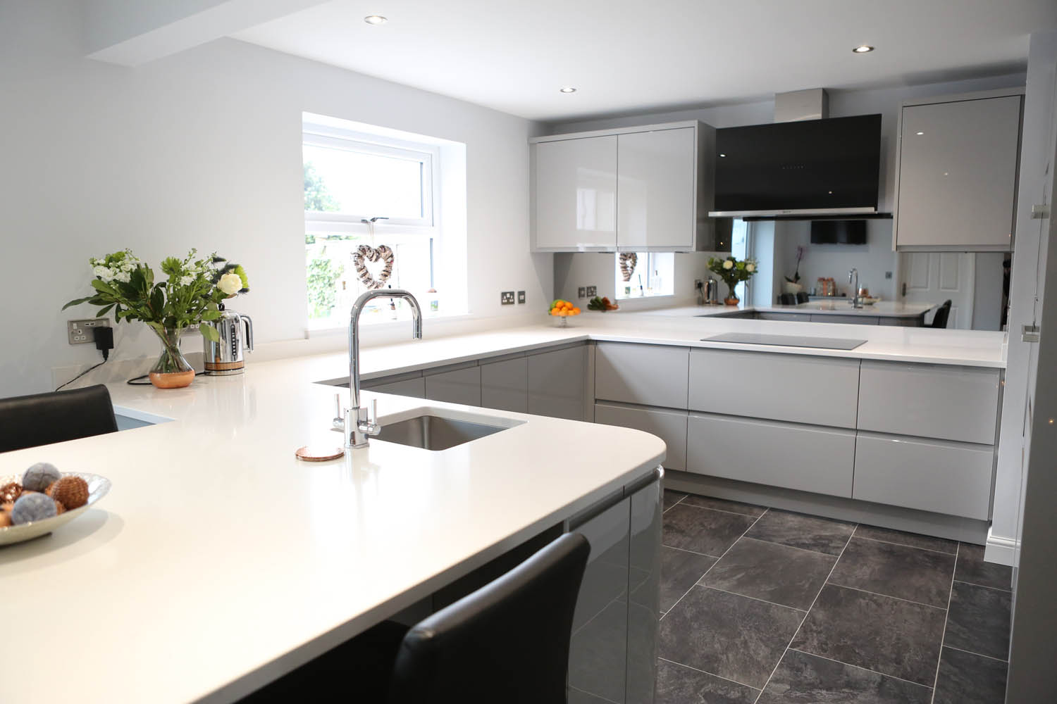 Smoked Mirror Splashback and Gleaming White Worktops