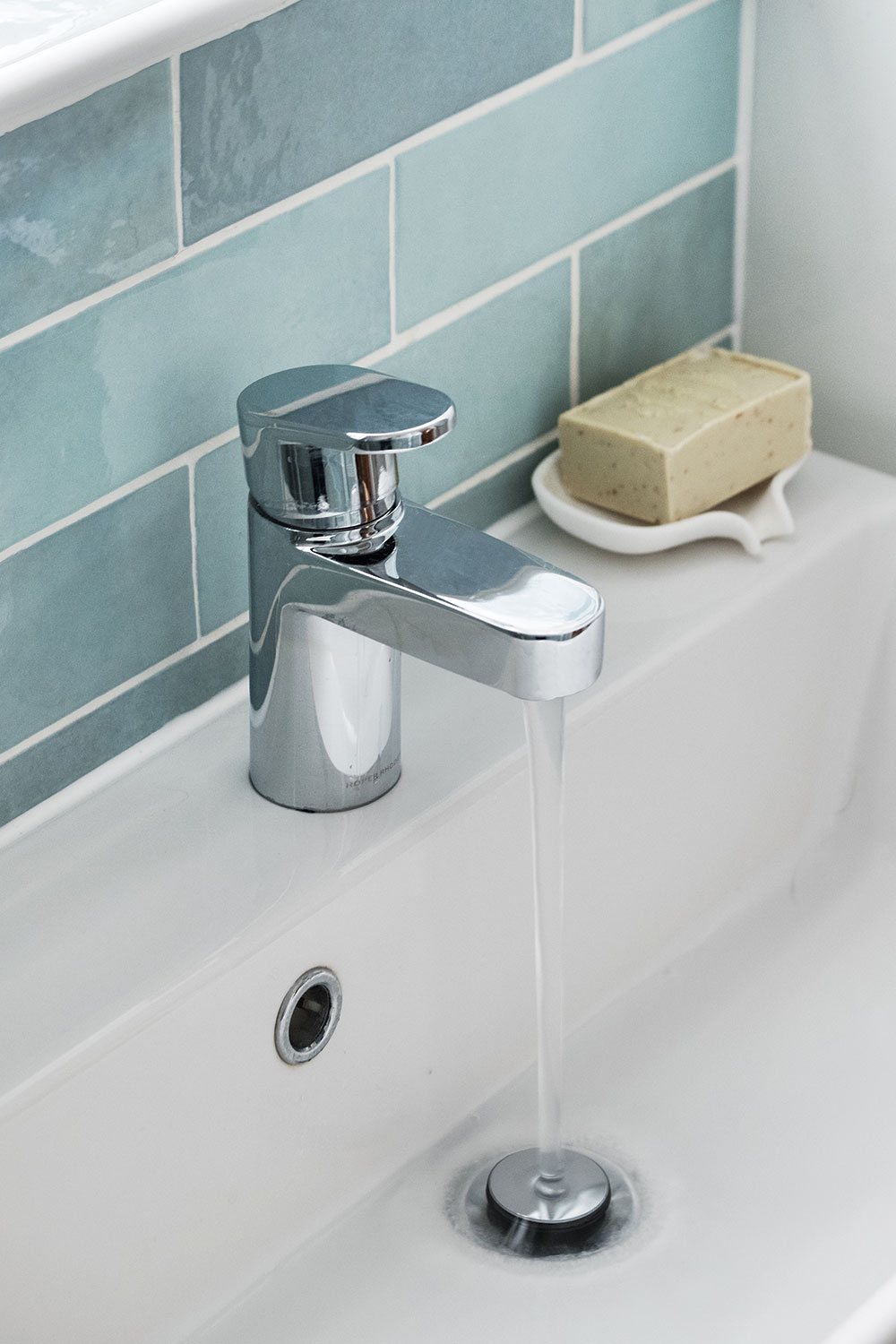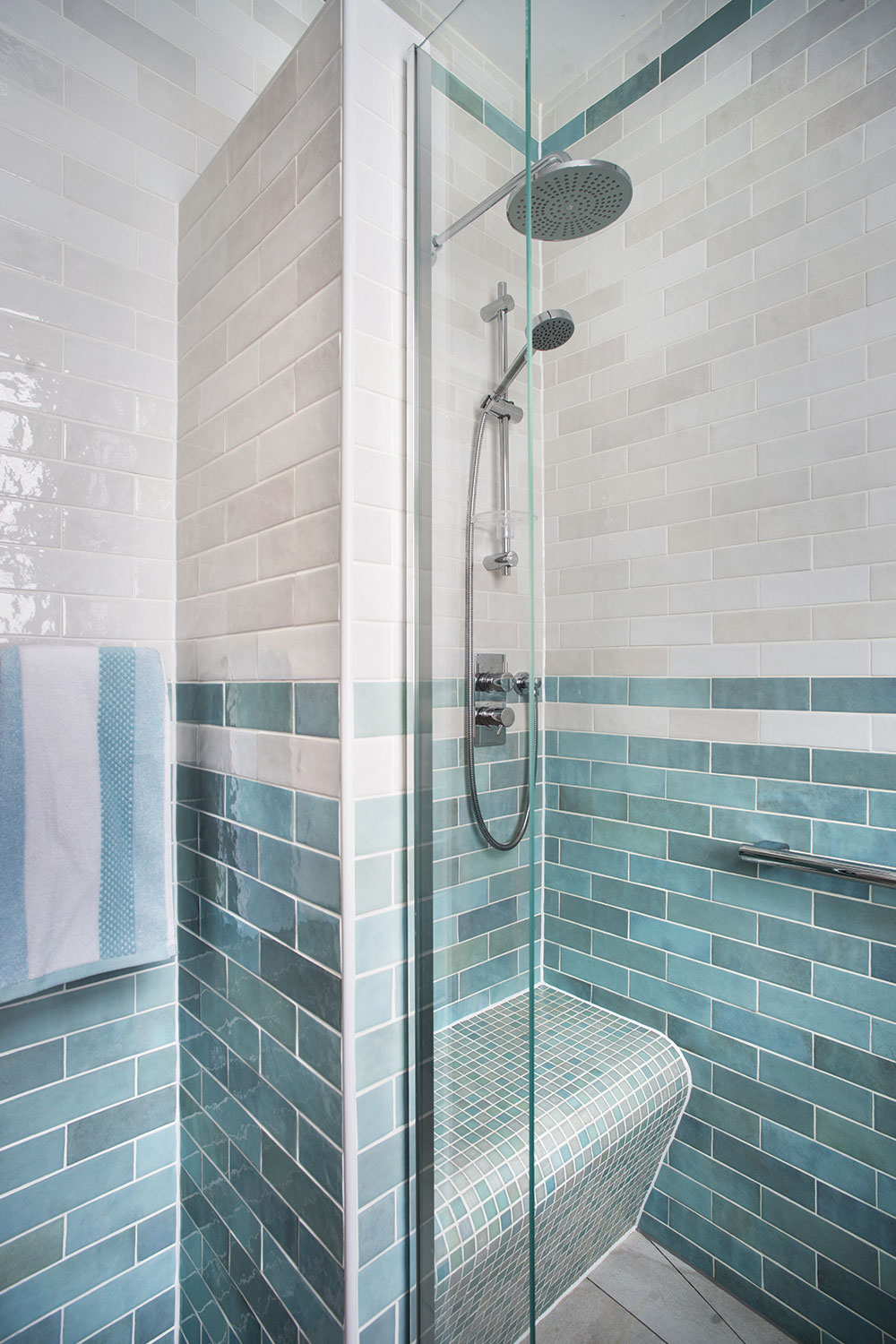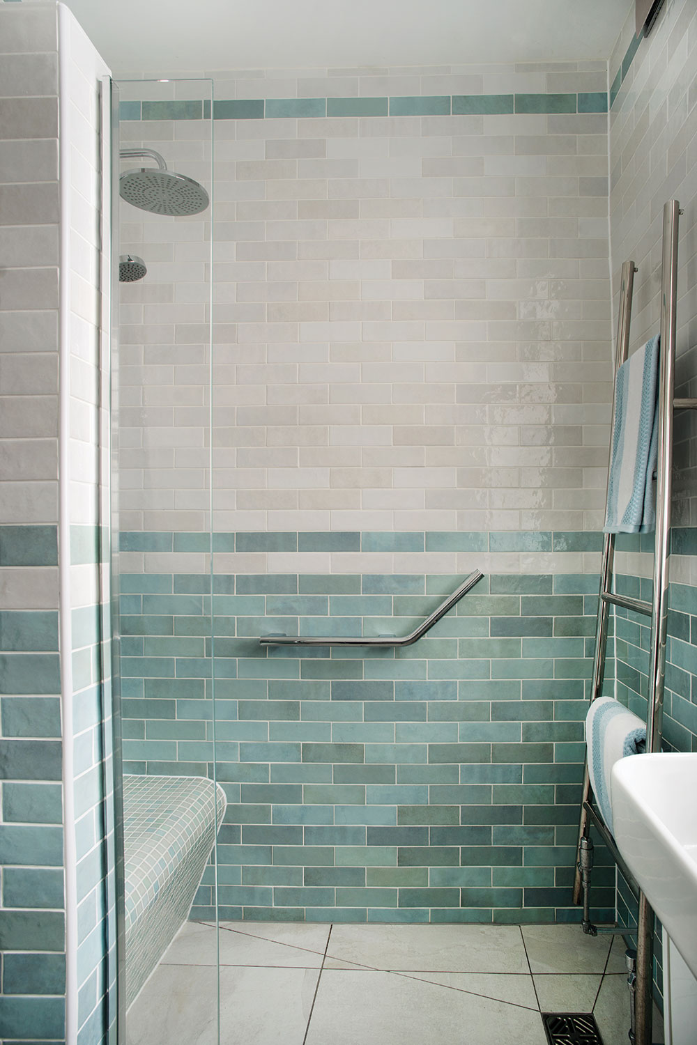 All walls but one have been fully tiled. The couple chose a mix of timeless off-white and blue-green metro tiles, boosting natural light and giving the bathroom an airy, coastal vibe. For contrast, the curved shower seat is clad in shimmering aquamarine mosaics,