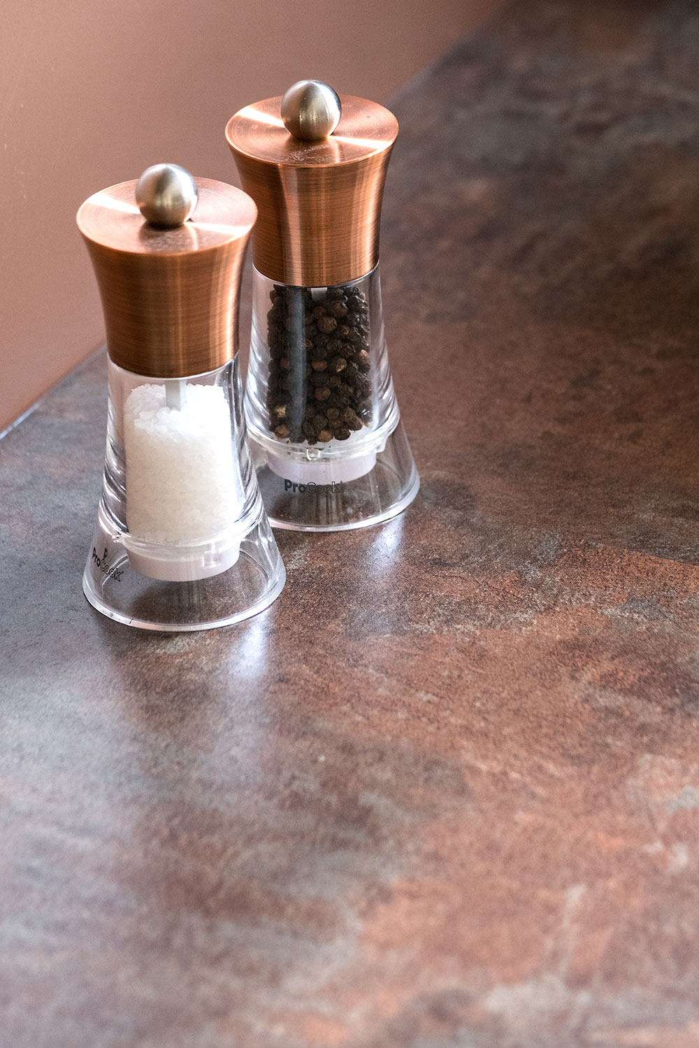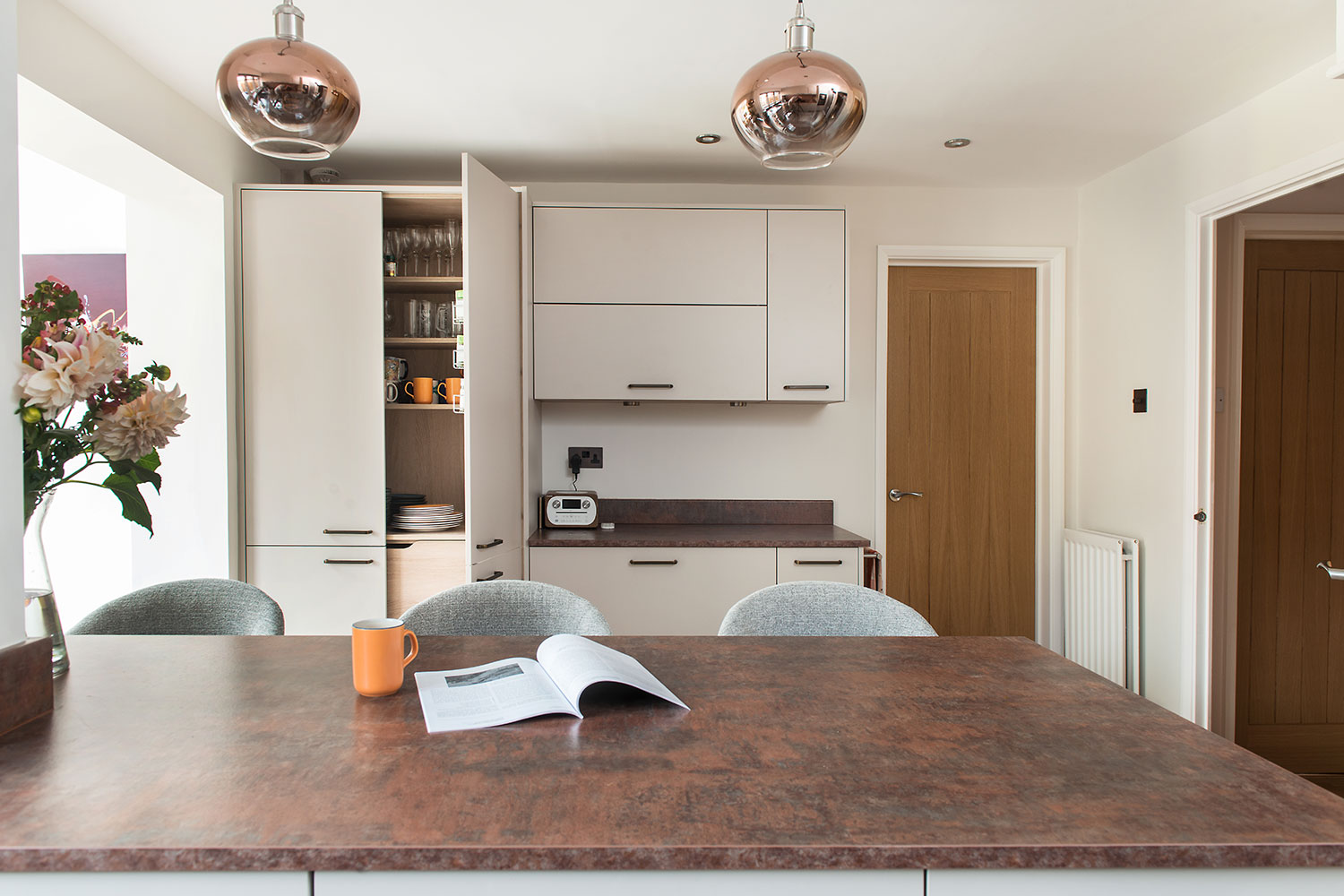 Keen to keep their kitchen low-maintenance, Naomi and Jonathan chose plain, flat, easy-wipe doors in a warm, neutral shade. They specified a wood-effect finish inside the cabinets, but requested that the underside of the wall-units matched the doors, and that the integrated lighting did not protrude. Zoe’s attention to detail ensured all their must-haves were met, and they were impressed with the care taken, and high standard of fitting achieved by our recommended installer. Bronze-toned laminate work tops and pinkish-brown glass splashbacks emphasise an inviting feel,