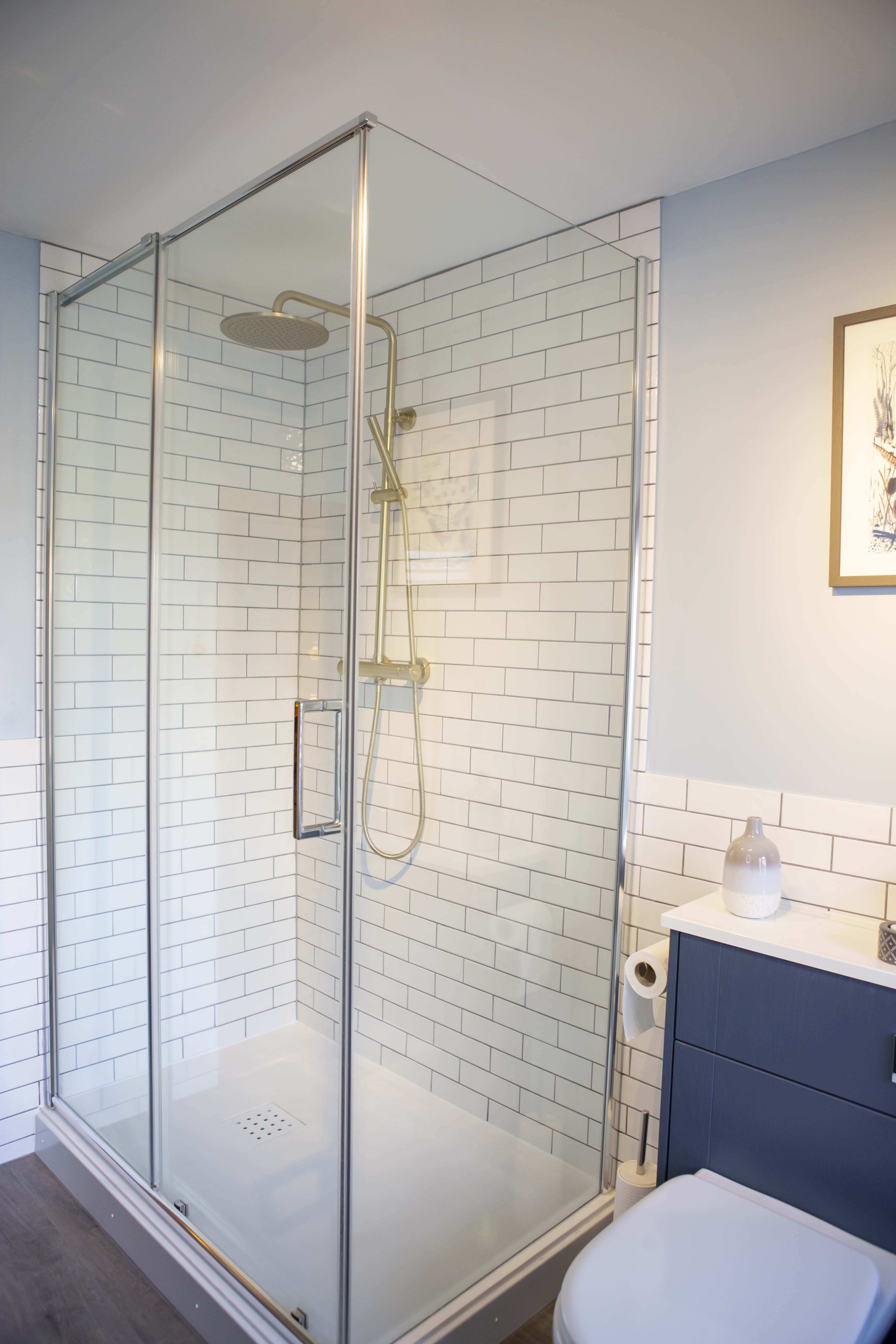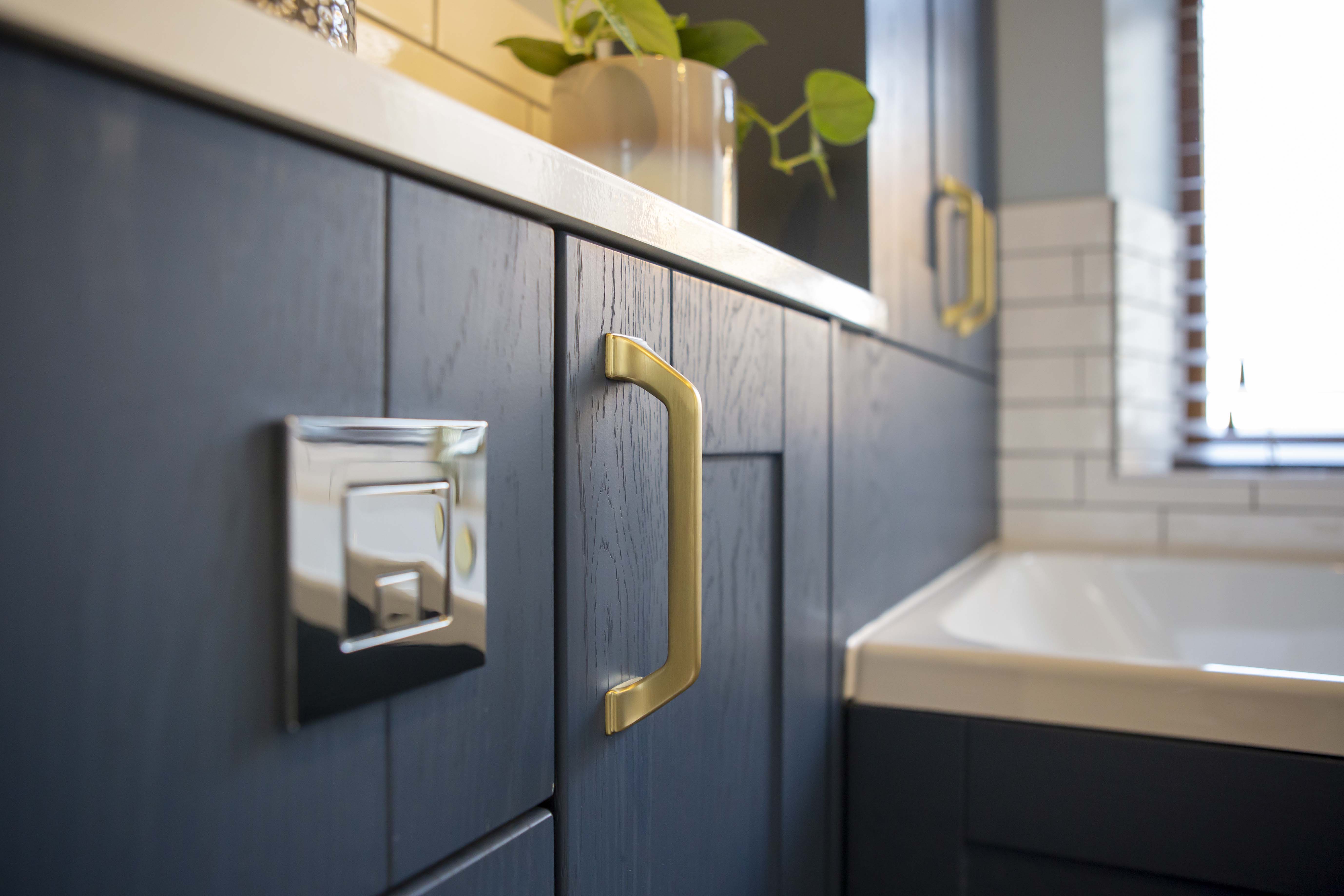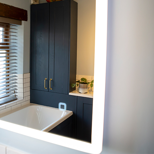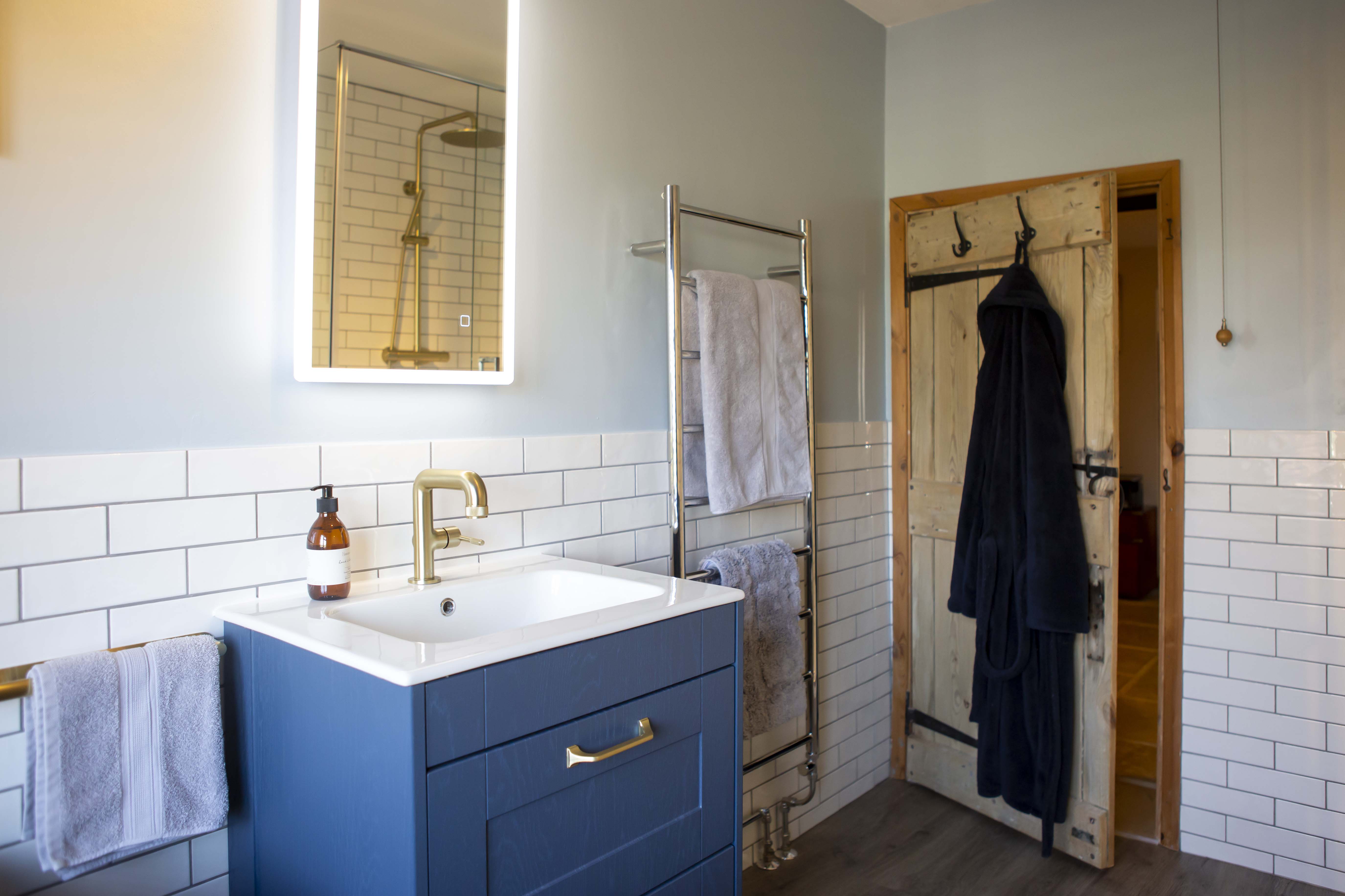 Having a clear idea of the colour scheme for the bathroom even down to the flooring, tiles and bathroom cabinets, Rod required assistance with putting all his ideas down into a bathroom plan. David, one of our bathroom designers helped Rod decide on the brassware, furniture and other important details that shaped the bathroom design. Rod included on his wish list a tall cabinet, which he wanted somewhere in the room but couldn’t work out how this would fit. Slimline bathroom cabinet units made all the difference to the bathroom space enabling Rod to have his tall bathroom unit behind the repositioned bath. The bathroom taps were also moved so that the bath now sits with perfect views of the countryside beyond. With David’s assistance, stunning brass tap and shower fittings along with WC and towel holder fittings adorn the bathroom complimenting the deep, blue cabinetry beautifully. There is also plenty of other storage in the bathroom cabinet underneath the sink unit.