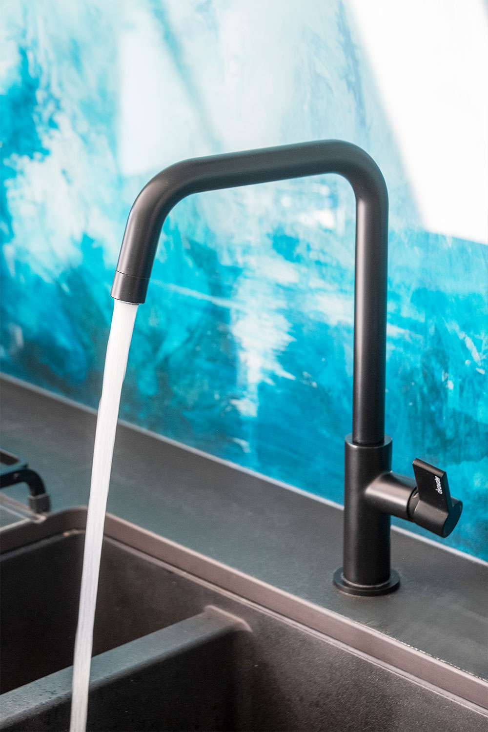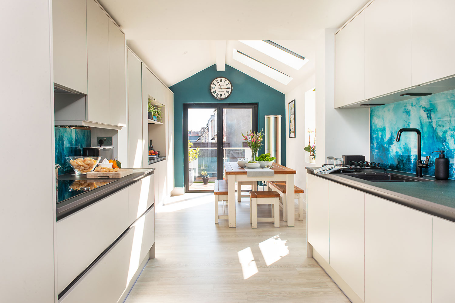 The couple settled on soft grey-coloured cabinets and black worktops. The stand-out features are the multi-toned, blue glass splashbacks, digitally back-printed with Jacqui’s own artwork. They wanted to use glass, but were struggling to choose a colour, when Zoe suggested to Jacqui, an art teacher, that she could create her own design,